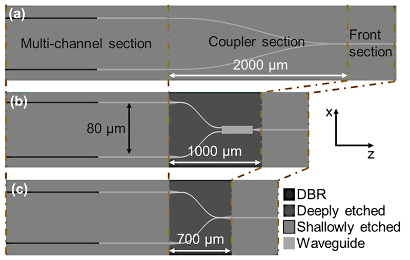 In previous designs, the ridge waveguides were shallowly etched as shown in Fig. 2 (a), resulting in a 2000 µm long coupler section (see Fig 1 (a)). To reduce the coupler dimensions, we theoretically investigated a new design based on two etch depths, see Fig. 2 (a) and (b). Here, the regions where optical gain is supplied, namely the multi-channel and front section, indicated in Fig. 1, are shallowly etched to ensure fundamental lateral mode operation. In contrast, the coupler section is deeply etched to provide a higher refractive index contrast, enabling a more compact coupler section design having a length of 1000 µm and 700 µm for the devices shown in Fig. 1 (b) and (c), respectively.