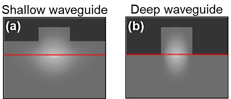 Fig. 2: Cross section of a shallowly (a) and a deeply (b) etched ridge waveguide - resulting fundamental mode is shown within each waveguide