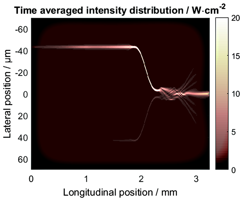 The device parameters of the integrated waveguide components, namely, S-bend, coupler and spot size converter were optimized using a numerically efficient simulation tool (FIMMPROP) for passive waveguides. Subsequently, the entire laser system was further analyzed applying the sophisticated traveling-wave equation based model WIAS-BALaser. Fig. 3 exemplarily shows the longitudinal-lateral (z,x) time averaged intensity distribution of the design shown in Fig. 1 (b) obtained by active BALaser simulations. In this specific case only the upper of two laser channels was electrically biased. It is visible that some of the forward traveling light got radiated behind the waveguide coupler. In addition, it can be seen that a part of the backward traveling wave is coupled into the lower unbiased laser arm. Those laser internal effects are neither accessible by passive simulations nor by experiments.
