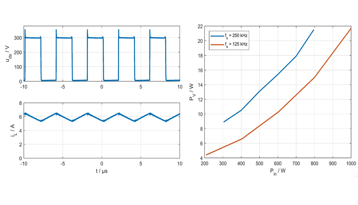 The converter was operated at 300 V with 250 kHz switching frequency and the losses were estimated by calorimetric methods. An efficiency of 97.3% was demonstrated for 800 W output power and 250 kHz switching frequency. The efficiency increased to 98.1% for 125 kHz switching frequency.