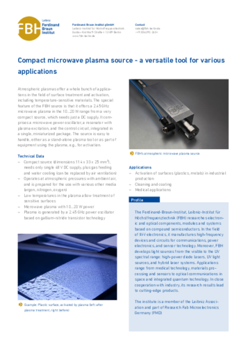 Atmospheric plasmas enable cost-effective treatment of surfaces, for example activation and cleaning of metal and plastic surfaces. For this purpose, we have developed an extremely compact plasma source that generates a plasma with up up to 20 W. Thus, even temperature-sensitive materials can be processed. It is also suited for medical applications.