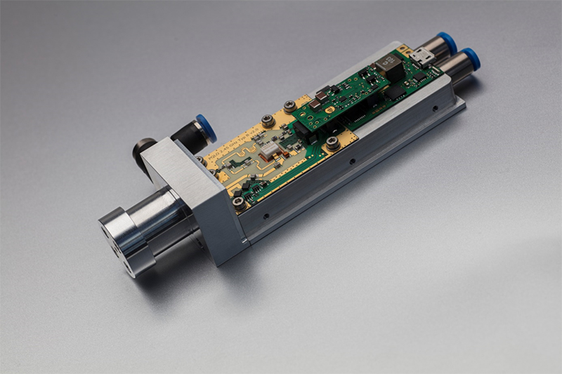 The housing of the plasma source shows very small form factor (114 x 33 x 25 mm³), it contains a resonator for plasma excitation in the 2.45 GHz ISM band, the corresponding GaN-based power oscillator, and the electronics for control and monitoring.