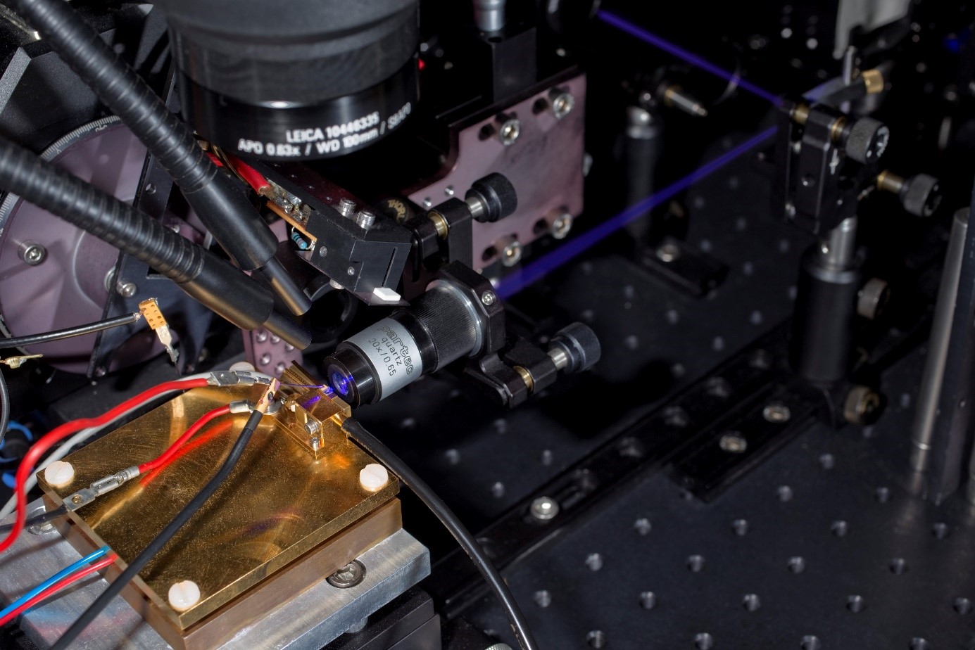 We develop diode lasers based on the (InAlGa)N material system. We specifically tune their properties to the respective field of application - such as atomic spectroscopy or atomic clocks for integrated quantum technology. For such applications, the lasers must in particular offer narrow-band, temperature-insensitive emission at a precisely defined wavelength. They must also be capable of long-term stable operation with moderate emission powers and good beam quality.