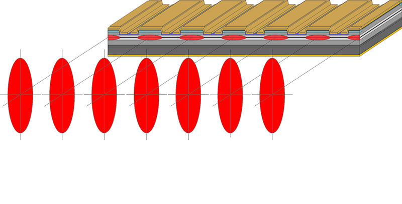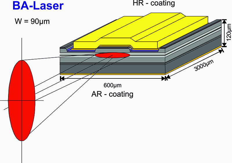 The aim of our research work is to understand and address the limitations to power, efficiency and beam quality of high-power broad-area diode lasers. Further research topics include increasing reliability and reducing spectral linewidth in the wavelength range between 630–1200 nm. In addition, we are investigating novel device concepts, such as technology for monolithic wavelength stabilization.