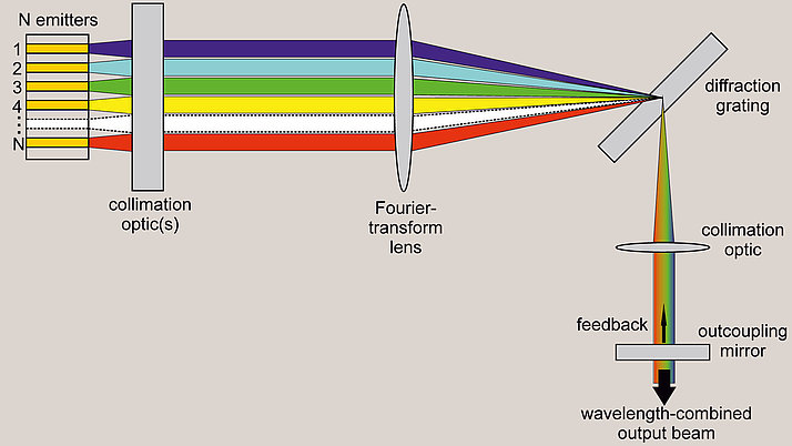 We offer a wide range of technologies and reproducible processes to manufacture gallium arsenide laser diodes with defined properties. If required, we introduce grating structures into the laser resonator of DFB and DBR diode lasers to stabilize the wavelength. We also integrate our diode lasers into particularly compact micromodules and open up new applications with the portable light sources. To directly use diode lasers in applications that require high brilliance, such as in materials processing, we develop and optimize processes for beam combination.