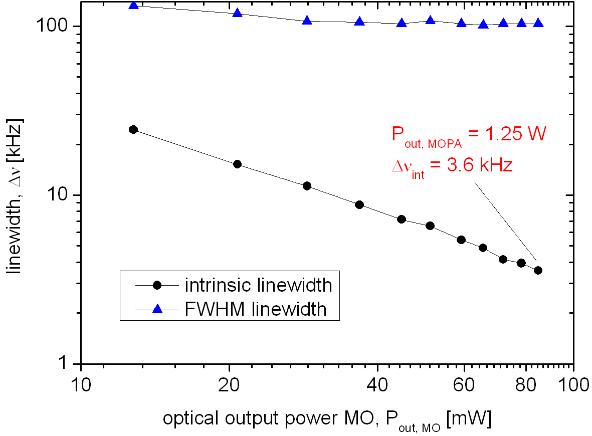 The MOPA module is depicted in fig. 1. The oscillator (MO) is a distributed Bragg reflector laser which is optimized for narrow-linewidth operation. The amplifier (PA) consists of a tapered amplifier and a ridge waveguide entry section. The output of the MO is collimated by a pair of aspherical cylindrical micro-lenses. The collimated beam is then guided through a micro isolator in order to suppress feedback effects and subsequently coupled into the amplifier by another pair of micro-lenses. The output of the MOPA is collimated by a three lens optical system in order to obtain a circular beam. All semiconductor components and optics are integrated on a footprint of 50 x 10 mm2. The output power of the module exceeds 1 Watt in stable single-mode operation with a conversion efficiency of 25%. The results of a heterodyne linewidth measurement are depicted in fig. 2. The full width at half maximum (FWHM) linewidth is approximately 100 kHz over the entire power range. The intrinsic linewidth Dnint (a measure for the linewidth that excludes technical noise) is following the theoretically expected 1/P dependence with a minimum value of 3.6 kHz at a total output power of the MOPA (Pout, MOPA) of 1.25 W (output of the oscillator Pout,MO = 85 mW).