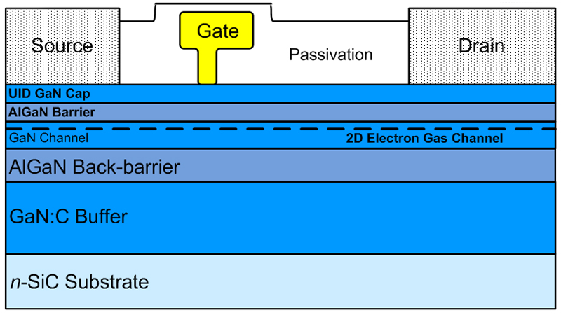 The FBH developed new GaN‑based heterostructures on conductive low‑cost substrates that unite enhanced vertical insulation for transistors with high off‑state blocking capability and low dynamic on‑state resistance. The GaN‑based epitaxial structure combines a GaN:C‑buffer for vertical insulation and high lateral breakdown strength, a low Al content AlGaN back‑barrier to separate the carbon doping from the UID GaN channel layer, and UID GaN cap encapsulation (see Fig. 1).