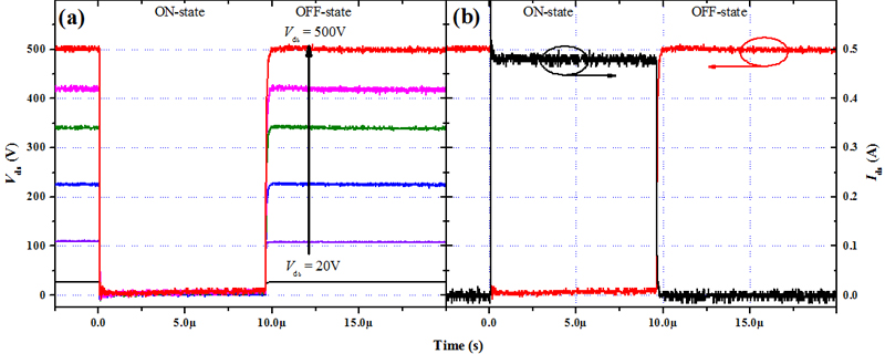 Fig. 2: Switching characteristics of a packaged test device with 2.1 mm gate width and 15 µm gate-drain separation. VGS is switched from 5 V (OFF state) to +1 V (ON state) and back after 10 µs. (a) ON and OFF state drain bias characteristics from Vds>/sub> = 20 V to 500 V, (b) 500 V / 0.5 A current and voltage switching transients.
