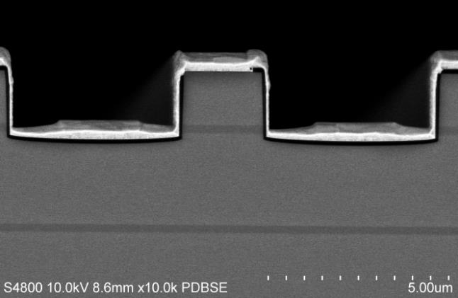Fig. 1 shows a cross-sectional scanning electron microscope picture of the fabricated phase modulator. The epitaxial layer structure of the P-p-n-N W-shape waveguide was grown on a 3-inch (001) n-GaAs substrate using metal-organic vapor phase epitaxy (MOVPE). Si and C were used as n- and p-type dopants, respectively. For the modulator under investigation, Al0.35Ga0.65As was selected for the waveguide core with a band gap energy of 1.90 eV, which is sufficiently larger than the photon energy of 1.59 eV.