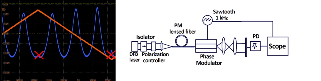 The modulation efficiency measured using the Fabry-Perot (FP) interference method (see Fig. 2) was 16°/(V ∙ mm). The total modulator capacitance was estimated to be 250 pF at 0 V, limiting direct modulation with a 50 Ω source to 13 MHz. The capacitance of the modulator can be reduced by one to two orders of magnitude by means of adding a benzocyclobutene polymer (BCB) passivation layer between the p-metallization and the upper cladding instead of the thin SiNx layer. This should increase the modulation bandwidth beyond 1 GHz with direct driving. As a result, GaAs/AlGaAs-based phase modulators are well-suited to become a compact and robust alternative for crystal-based modulators.
