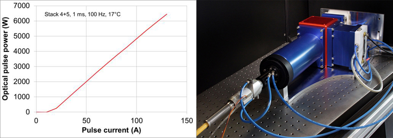 Stacking the sandwiches, mounting the DCB-coolers and fabricating the body of the complete pump module is carried out by the C2GO inprocess solutions GmbH. The module with the laser cable (fiber) and the output power/current characteristics are shown in Fig. 4. It demonstrates the simple and robust design specialized for QCW pump modules, which is putted to the test right now.