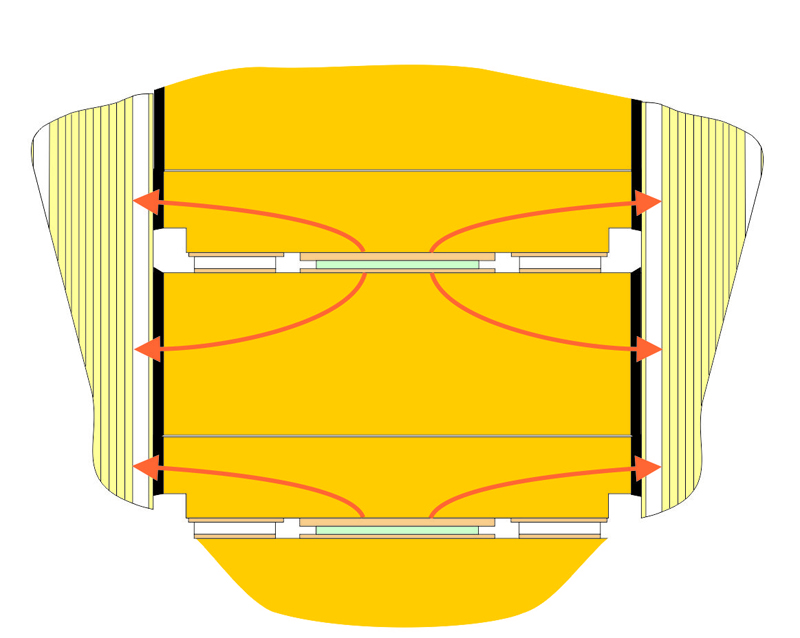 The newly developed type of mounting is shown in Fig. 3. In order to achieve an efficient passive cooling two measures have been taken. Firstly, two expansion-matched CuW blocks are soldered to the chip. Secondly, the dissipated heat flows to both sides from the chip to two DCB water coolers which are soldered to the left and right sides of the CuW blocks (red arrows). Two Al2O3 spacer plates beside the chip protect it from outer pressure. All solder joins within the robust CuW/chip/CuW sandwich are made of AuSn.