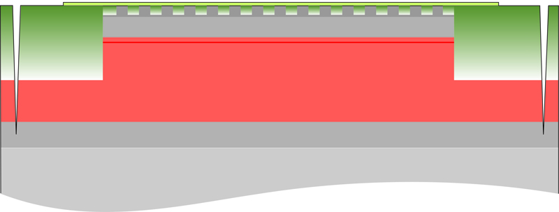 The chips have a lateral aperture of 1.2 mm which is fitted to the fiber input. The cavity length is 6 mm. Some special measures ensure the pulse operation with high excitation levels (Fig. 2). These include stripes of shallow implantation, deep implantation and grooves beside the cavity and an extreme, double-asymmetrical super-large optical cavity.