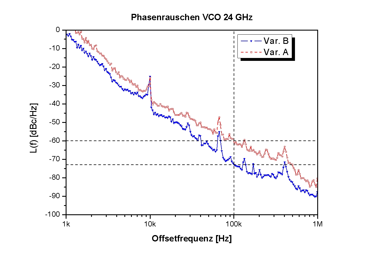 The two versions differ in the choice of the frequency-determining spiral inductor with respect to its quality factor and in the way the varactor is coupled, see Fig. 1. Fig. 2 presents the phase noise spectrum of both versions of the VCO. Clearly, version B exhibits a phase noise lower than that of version A by 10 dB at 100 kHz offset, which translates into enhanced localization accuracy.