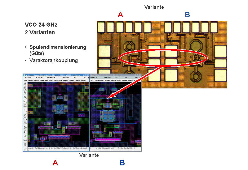 The localization block is based on radar principle at 24 GHz and its core is a voltage controlled oscillator (VCO) generating the radar signal. For high localization accuracy in the range of a fraction of an inch it is necessary to have a radar signal with low phase noise. This is due to the fact that phase noise directly determines the localization accuracy. In the framework of the BMBF project LoWiLo (Low-power Wireless Sensor Network with Localization), such a 24 GHz low phase-noise VCO was developed at FBH [1]. Based on an advanced 130 nm CMOS technology, some versions of cross-coupled VCO were designed and characterized.