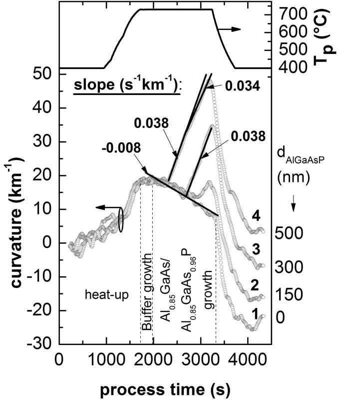 Such a growth process is ideally monitored and controlled by using in-situ curvature measurements. Fig. 1a shows curvature transients during growth of AlxGa1‑xAsy P1-y layers using metal-organic vapor phase epitaxy (MOVPE). The growth of a 500 nm thick Al0.85Ga0.15As0.96P0.04 layer already over-compensates the compressive room temperature strain of a 150 nm thick Al0.85Ga0.15As layer. However, as is shown in Fig. 1b the corresponding HRXRD measurement indicates a deteriorated crystal quality for that sample. In contrast, a 300 nm Al0.85Ga0.15As0.96P0.04 layer (3) leads to a rather small residual room temperature strain, but high crystal quality is maintained.