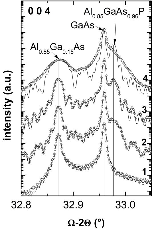 Fig. 1b: HRXRD measurements of 4 samples in (a) - sample 4 does not show any fringes -► deteriorated crystal quality.