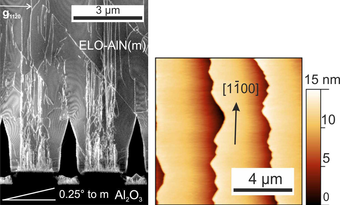 Fig. 1: ELO-AlN(m) template: cross-sectional dark-field micrograph showing threading dislocations (left); AFM image of the surface with periodic macrosteps.