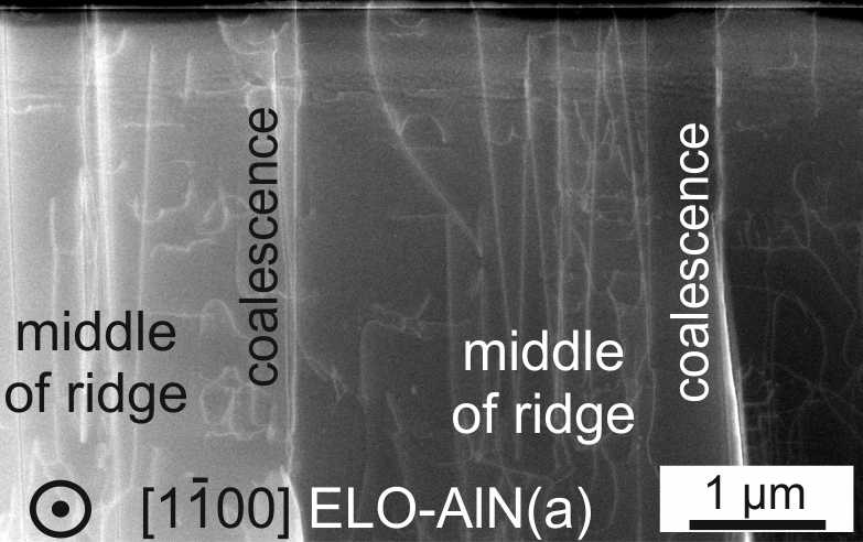The achieved defect reduction is accompanied by a number of challenges arising from the offcut of sapphire substrates. For example, the sapphire offcut and the applied pattern geometry result in formation of periodically arranged macrosteps on the surface of the coalesced ELO-AlN(m) layers (Fig. 1 right). The presence of surface macrosteps can have a deteriorating influence on the quality of subsequently grown AlGaN layers with a high Ga content in terms of increasing defect density and compositional inhomogeneity.