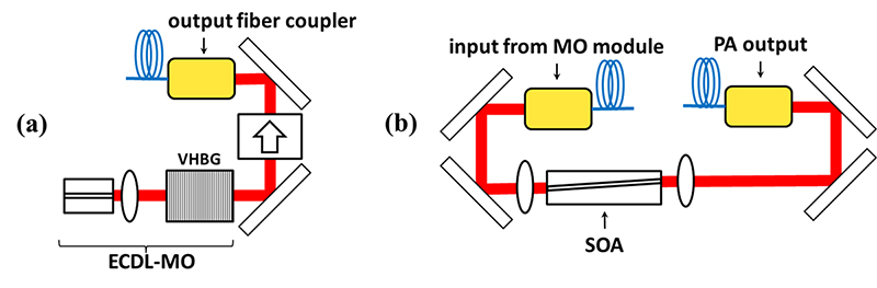 For the MO module, the optical cavity of the ECDL is defined by the front facet of a 2 mm long ridge waveguide laser chip and a volume holographic Bragg-grating with a nominal resonance frequency of 344.179 GHz (871.035 nmvac) at 30°C. The MO module has a single-stage miniaturized isolator (30 dB isolation, insertion loss is 8 dB at 871 nm). The fiber-coupled output of the MO module is then fed into the PA module via an external faraday isolator to guarantee sufficient isolation (>55 dB) between the ECDL-MO and the SOA. Both modules are fiber-coupled. They are realized on a micro-optical bench that is adhesively connected to a Kovar housing. The total mass of each module is 750 g [2]. Please note that the integration of the MO and PA within a single module is also feasible. However, no optical isolator with sufficient optical isolation at the wavelength of 871 nm was available for micro-integration.