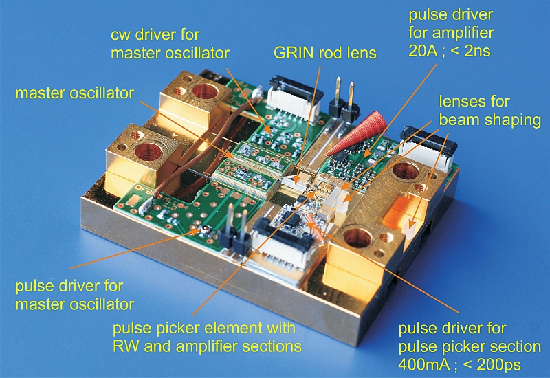 The optical components as well as the high frequency electronics are mounted on a micro bench with a footprint of 5 x 4 cm2 (see Fig.). A 1 cm long monolithically integrated 4-section DBR laser is used as master oscillator generating ultra-short light pulses by mode locking with a full width at half maximum of 10 ps and a repetition rate of ~4,3 GHz (230 ps pulse spacing). The optoelectronic device with high frequency-gated RW waveguide and pulsed tapered amplifier) consists of two sections and is used for pulse selection and amplification. Coupling between these devices and beam shaping behind the tapered amplifier is executed by means of micro-optical lenses. All parts are adjusted and fixed to each other with highest precision. The compact setup results in a highly stable assembly. For electronic excitation, FBH uses in-house developed ultra-fast GaN transistors with low capacitance and high current density. Specifically challenging for the picking of single pulses is to switch the current pulses on and off within 100 ps.