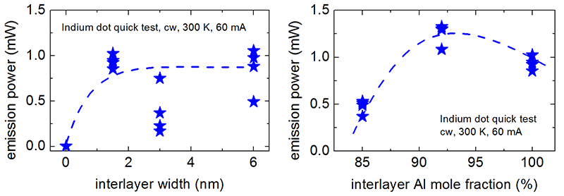 The output power from 265nm LEDs measured on wafer with varied thickness (left) and aluminum content of the AlxGa1-xN interlayer (right)