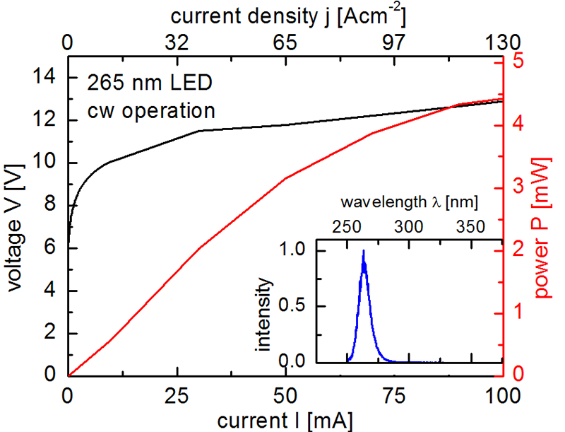 TU Berlin and FBH have therefore started to develop UV LEDs emitting around 265 nm and achieved competitive devices by carefully optimizing the current injection efficiency. All LED structures were based on epitaxially laterally overgrown (ELO) AlN-templates on sapphire, whose threading dislocation density is reduced in comparison to conventional planar AlN templates. Thisallowed for an enhanced radiative recombination.