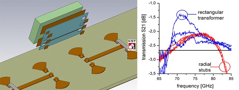 Fig. 1: Example of a 77 GHz interconnect in LTCC flip-chip technology with radial stubs: geometry (left) and thru-line measurement results for the radial and a rectangular stub geometry (right)
