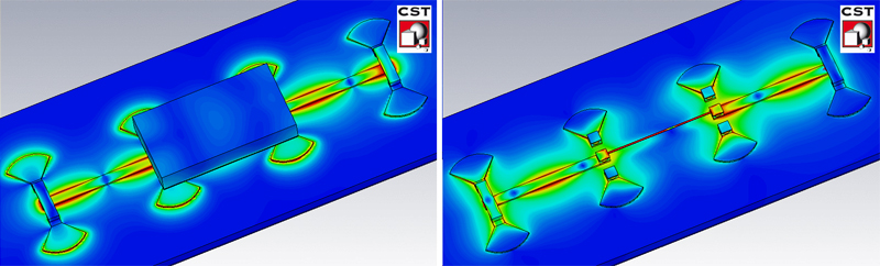 Fig. 1 shows a solution for this problem using radial stubs. A newly developed design with rectangular pads offers sufficient bandwidth and additionally provides improved isolation. The latter quantity describes crosstalk between the different chip interconnects, e.g. input and output of an amplifier, and different elements on the LTCC substrate and is essential for the performance of the radar frontend. Fig. 2 presents a field plot related to this issue. One observes a typical parasitic effect, a surface wave propagating along the top side of the chip thus contributing crosstalk. Such effects are characteristic for chip packaging in the mm-wave frequency range and need to be suppressed by proper design.
