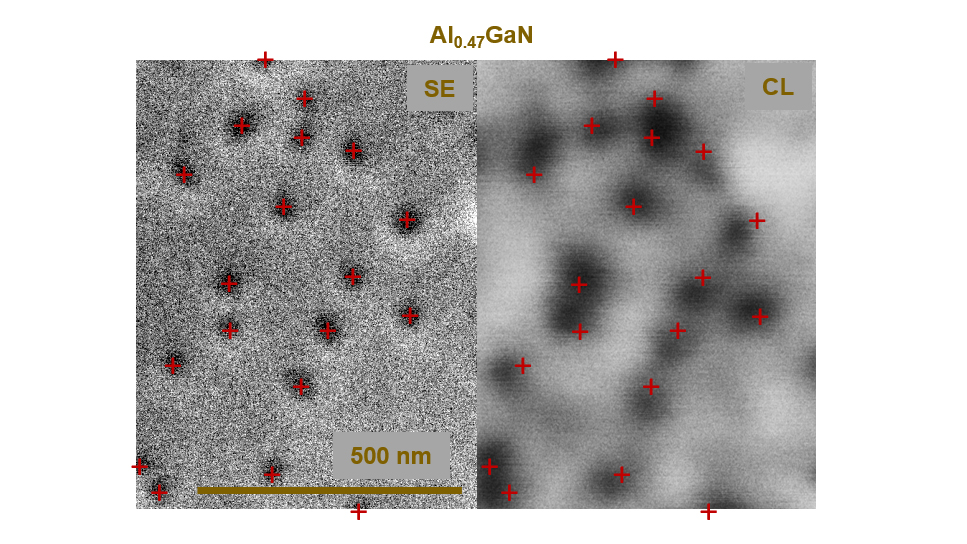 Fig. 2: Etch pit positions (SE image) and dark spot positions (CL image) correlate. Due to strain fields around dislocations, a locally varying band gap energy, and tilt of TD, the center of dark spots is typically slightly offset from the position where dislocations end at the surface of the layer.