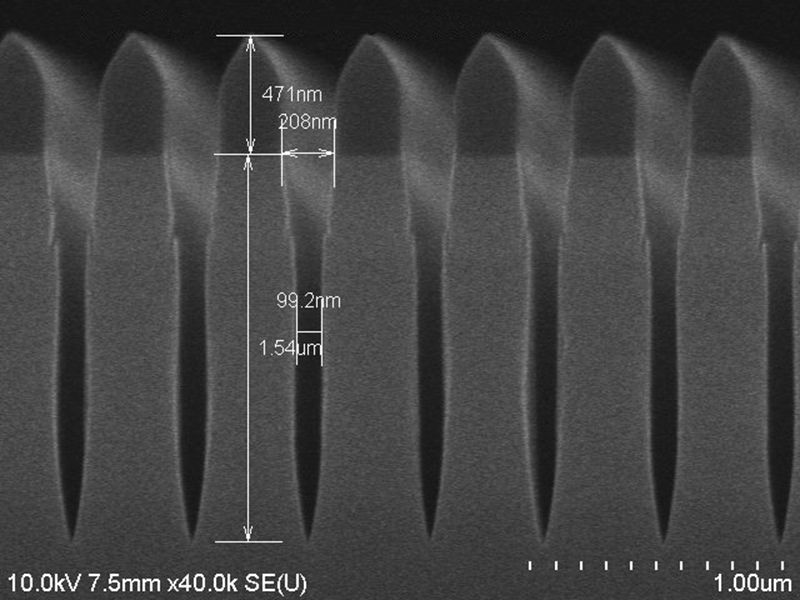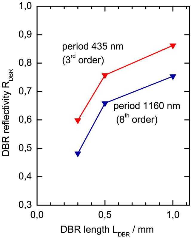 However, when using electron-beam lithography (VISTEC SB251) structures with significantly smaller dimensions can be processed. An increased resolution allows us now to produce surface gratings with ≥ 240 nm period. For that purpose an etching technology is developed allowing to transfer resist gratings up to 1.5 µm deep into the semiconductor, see Fig. 1. The resulting low order gratings show increased reflectivities compared to higher order gratings including enhanced wall-plug efficiencies of DBR lasers. Fig. 2 depicts a comparison of determined reflectivities of fabricated gratings of 3rd and 8th orders. In addition, it has been demonstrated that the electron-beam process is more flexible and offers an improved reproducibility.