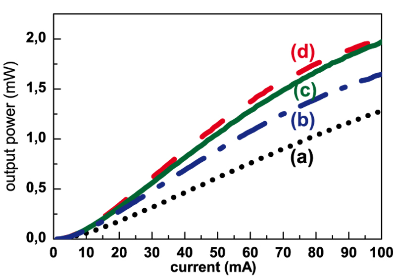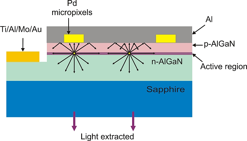Light emitting diodes (LEDs) emitting in the ultra-violet (UV) spectral region are interesting for application fields such as water purification, curing of plastics, spectroscopy, and bioanalysis. For many of these applications the currently low efficiency of UV LEDs has to be significantly increased. One of the issues to be solved is that a large proportion of the generated UV light does not escape the chip but gets lost due to internal absorption. Following a novel design approach, a breakthrough has now been achieved with FBH’s semiconductor chip. Instead of a large-area electrical contact above the light-emitting area as commonly used in conventional UV LEDs, an array of nano contacts made of palladium (nanopixels) has been utilized whose spacing is filled with aluminum. Whereas the nanopixels ensure efficient current injection, the aluminum acts as efficient reflector for UV light, so that absorption losses at the chip surface are reduced.