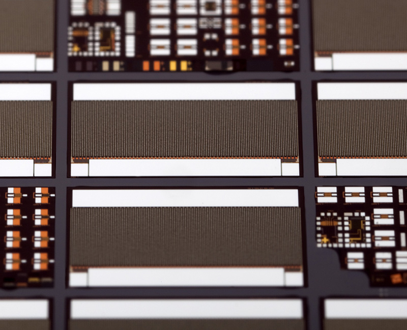 The FBH develops normally-off GaN transistors based on a p-GaN gate technology. Switching transistors with 150 mm gate width have been realized showing an on-state resistance RON = 100 mΩ and a maximum pulse current of 75 A for 300 V blocking strength.
