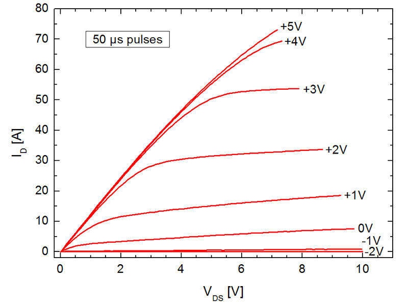 Fig. 2: Pulsed output characteristic of a GaN power transistor in p-GaN gate technoloy with 150 mm gate width showing an on-state resistance of RON RON = 80 mΩ for 5 V gate bias