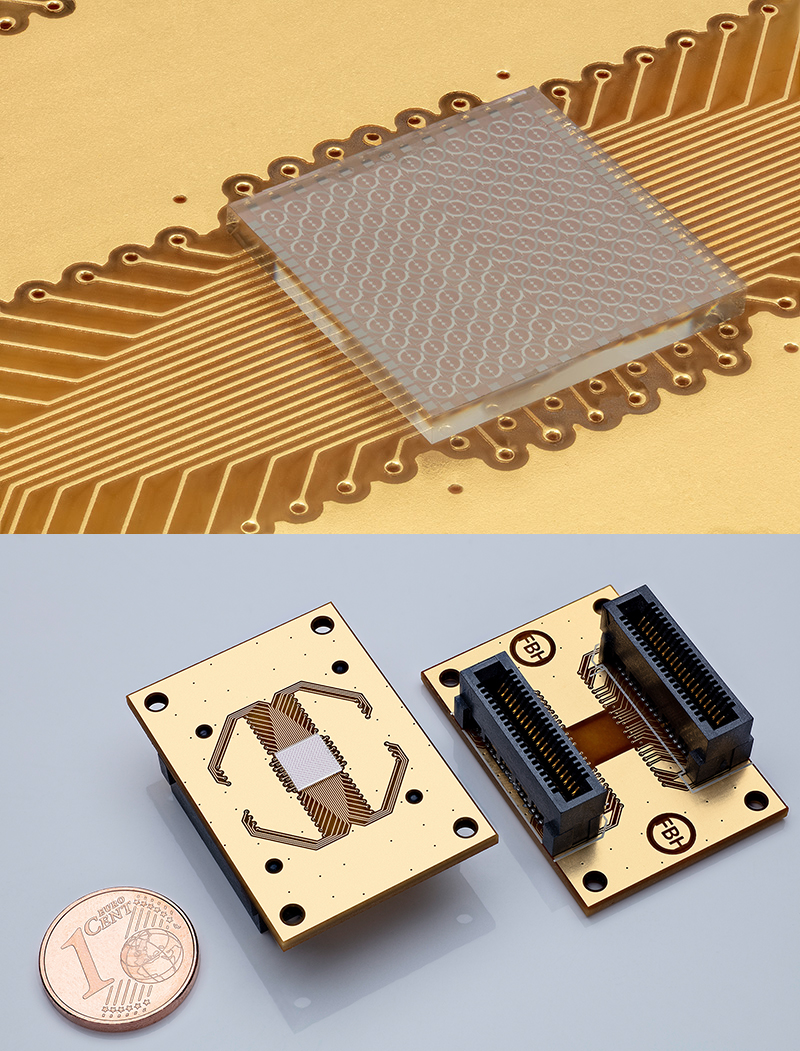 In many industrial applications, fast line scans or focal plane cameras are mandatory. Therefore, FBH is working on arrays of THz detectors, in order to maintain the excellent single detector performance in case of THz cameras. Fig. 3 demonstrates first 12 x 12 pixel focal plane arrays of THz detectors using bow-tie antennas. The chip area is 5 mm x 5 mm with a pixel pitch of 380 µm. These arrays can be stitched for larger THz camera arrays.