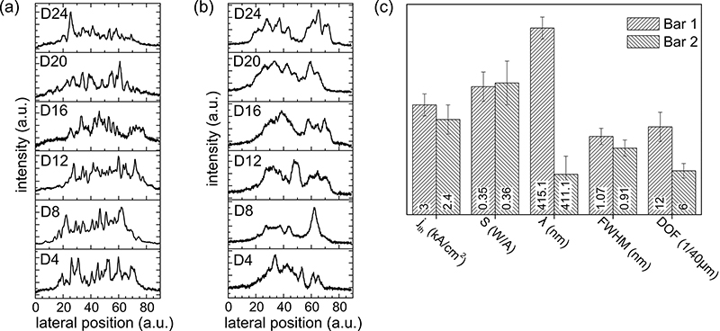 It has been observed that lasers from one bar, i.e., from the same area on the wafer show a similar number and width of intensity maxima and minima. In contrast, lasers from different areas of the wafer exhibited significant differences in the homogeneity of the lateral beam profile. To quantify these observations, the DOF (degree of filamentation) can be defined as the number of intensity maxima per 40 µm. According to this definition, bar 1 shown in Fig. 2a features a DOF of 12±2 while bar 2 (Fig. 2b) has a DOF of 6±1, confirming the visual impression.