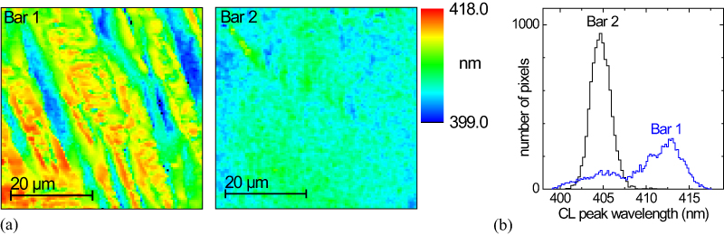 By means of spectrally and spatially resolved cathodoluminescence measurements the peak emission wavelength of the quantum wells at different positions on one bar and on different bars can be compared. Fig. 3 shows comparative wavelength maps from two bars. Clearly, the wavelength on bar 1 varies much stronger in the probed area (50 × 50 µm) than on bar 2. These significant differences in the quantum well band gaps explain all previously described effects. The influence on the basic parameters (jth, S, λ, FWHM) has already been predicted theoretically by Vurgaftman et al. (IEEE J. Sel. Top. Quantum Electron. 3, 475 (1997)) using simulations. The effects are, in principle, caused by a lower differential gain (jth), an enhanced absorption of high-energy photons in regions of lower band gap energy (S, λ), the diffusion of charge carriers in regions with smaller band gap (λ), and a broadening of the gain spectrum (FWHM). The enhanced filamentation of the beam profile has been investigated for the first time and can be explained by a reduced carrier diffusion length due to enhanced band gap fluctuations.