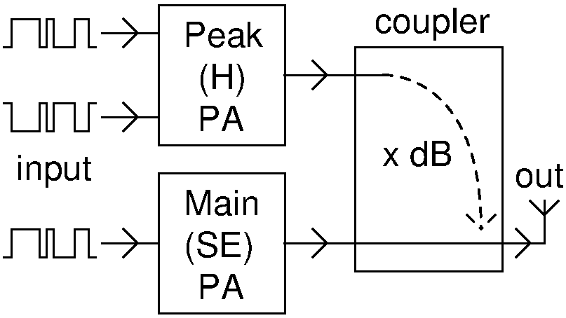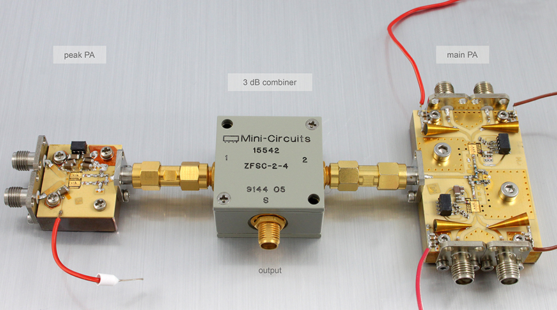 Recently, FBH has presented the first GaN-based digital sequential PA (DSPA) module that allows to flexibly tune the efficiency over a wide output power range at the International Microwave Symposium 2018 in Philadelphia (USA). The DSPA concept applies two independently designed digital amplifiers combined by an isolating coupler at the output (see Fig. 1). This setup uses an H-bridge and a single-ended digital PA. Driving the H-bridge in digital Doherty operation generates an additional efficiency peak compared to common (analog) sequential amplifier solutions. The DSPA setup (see Fig. 2) is optimized for 900 MHz, but can easily be used for other frequencies due to its broadband design. One only has to change the output circuitry (coupler, filter).