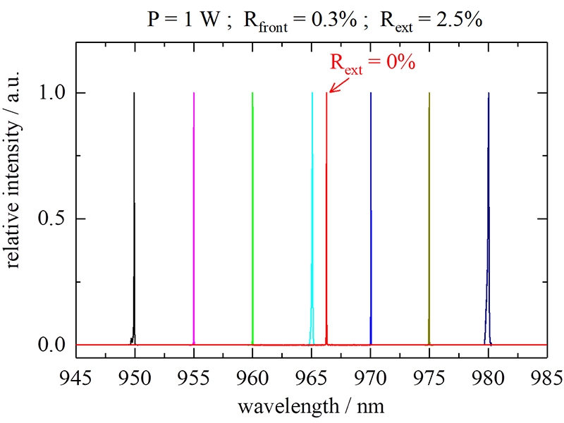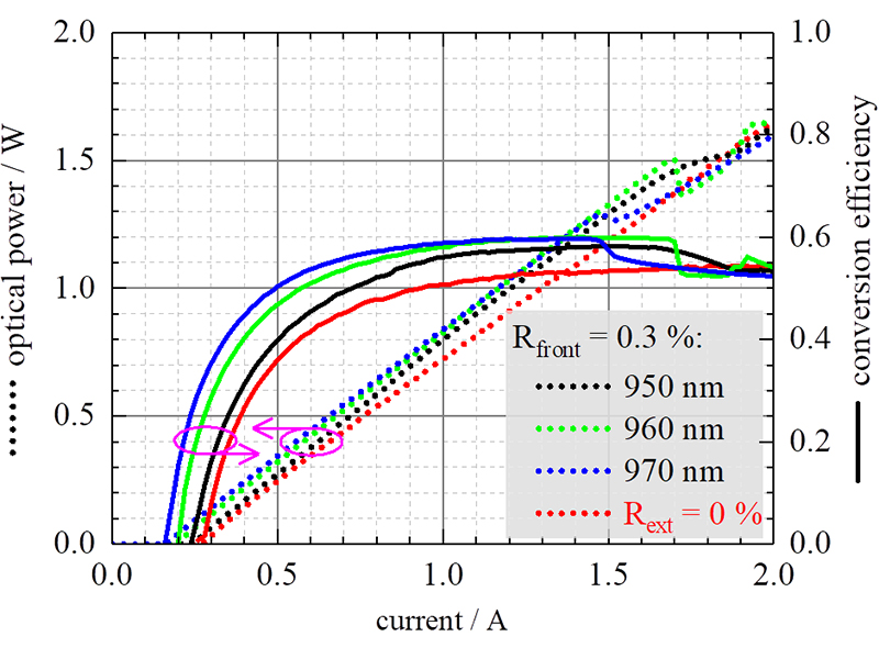 Fig. 2: Optical power and efficiency vs. current for single emitter stabilized at different wavelengths with 2.5% external feedback