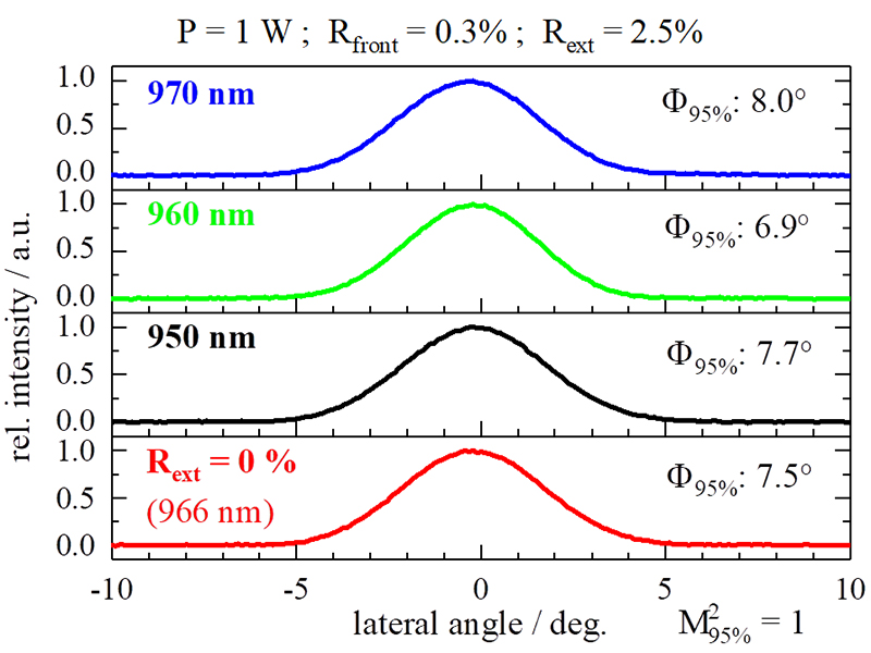 For single emitters, a locking range of 30 nm at a feedback ratio of 2.5% could be demonstrated (Fig. 1). Also, small arrays with five emitters and a pitch equivalent to full bars were externally stabilized, without showing any crosstalk between emitters. Between 950 nm and 970 nm, more than 1 W optical power with 57% to 60% conversion efficiency was reached for single emitters (Fig. 2). The corresponding lateral divergences at 1 W were below 8° (95% power content) with a diffraction-limited beam quality (Fig. 3). Even if other publications have demonstrated similar performances for single mode lasers, the efficiency was drastically decreased for bars. With our RW lasers, full bars with 200 emitters in free-running operation have delivered more than 350 W peak power and more than 55% peak efficiency [4]. A section of such a bar is shown in Fig. 4.