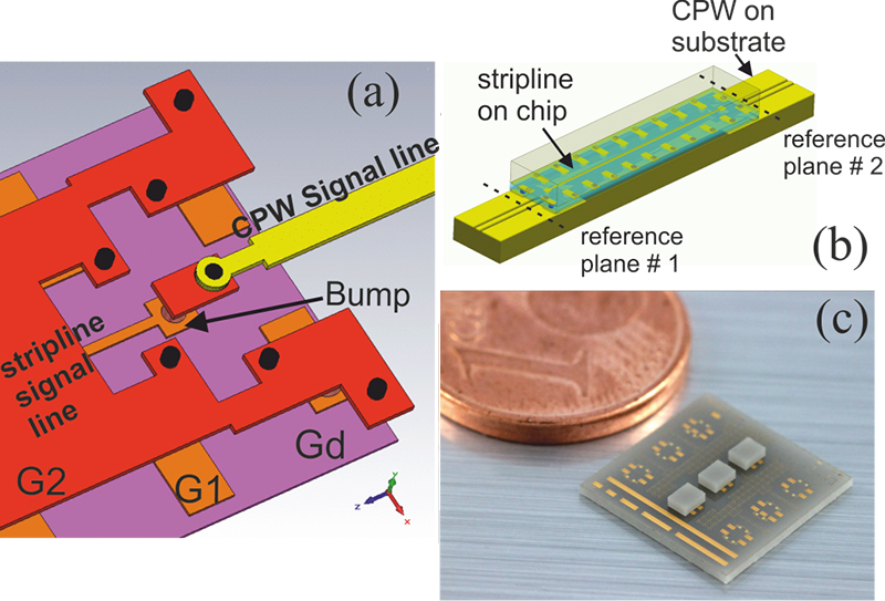 Recently, FBH has successfully developed flip-chip mounts operating up to 250 GHz, including a stripline-to-coplanar waveguide RF transition. The on-chip RF connections were realized as gold (Au) / benzocyclobutene (BCB) stripline waveguides, with an approximately 10 µm wide Au signal line sandwiched between top and bottom Au ground planes. BCB was used as a low-k interlayer dielectric.