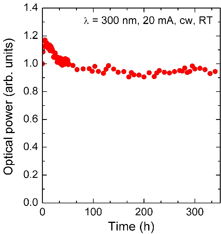 The design and the epitaxial growth conditions of the semiconductor layer structure were found to be the key to improve the LED efficiency. Using AlN buffer layers deposited on sapphire substrates at temperatures ≥1400 °C together with thick Si-doped AlGaN layers, templates for light emitting layers were fabricated whose dislocation density is in the range <1010 cm-2. Moreover, the composition and the doping of the electron blocking layer, which is intended to prevent electrons from overflowing to the p-side of the diode, were carefully optimized. Selected wafers of this first generation were used to process bottom-emitting LEDs which were flip-chip mounted on AlN submounts using hard-solder and measured on copper heat sinks in a calibrated integrating sphere. Fig. 1 shows that the LEDs feature maximum output powers of up to 5 mW at an emission wavelength of 300 nm. Moreover, degradation studies as presented in Fig. 2 show lifetimes of the LEDs of several hundred hours with very little degradation after the burn-in. Further optimization steps allowed to improve the performance of the LEDs even more. UV-B LEDs of the second generation, which were fabricated after these optimizations, reproducibly feature external quantum efficiencies in the range 0.5 to 1 % in on-wafer measurements. In the near future those LEDs will be available as mounted chips and allow us to build first demonstrators for the applications mentioned above.
