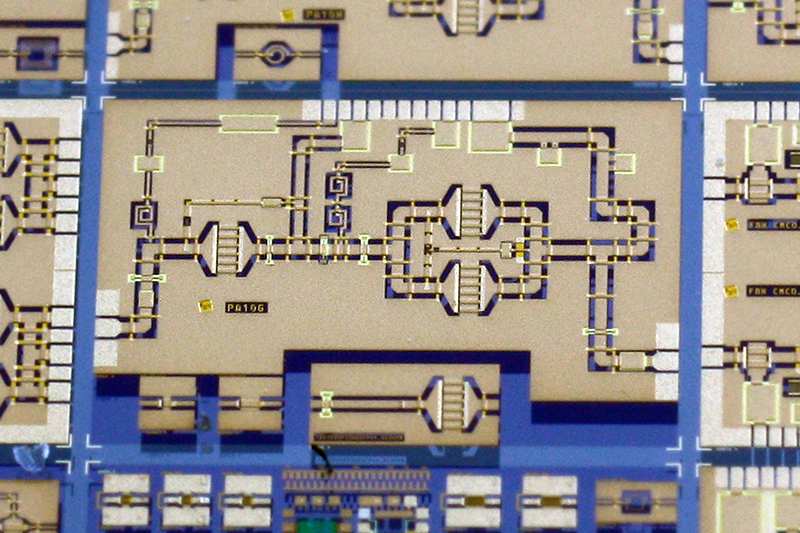 Fig. 1 presents a recently designed power amplifier MMIC realized by using this process. Because the GaN semiconductor layers are grown on silicon carbide (SiC), the substrate is transparent and the metal structure of the circuit seems to float. In order to achieve high gain, a two-stage design is employed. As can be seen from the measurement data in Fig. 2, this circuit reaches a maximum output power Pmax of 11 W at 10 GHz. The maximum linear gain is approximately 25 dB and the efficiency of the final stage (PAE) almost 40%. These values can be enhanced further by appropriate circuit optimization. Work on this is ongoing.