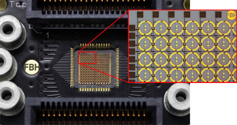 Fast THz cameras with high sensitivity are mandatory for many industrial applications. Therefore, FBH is working on focal plane arrays of THz detectors, in order to transfer the excellent single detector performance to a THz camera. This approach is documented in Fig. 3, presenting a 12 x1 2 pixel focal plane array of bow-tie detectors. The chip area is 5 mm x 5 mm with a pixel pitch of 380 µm.