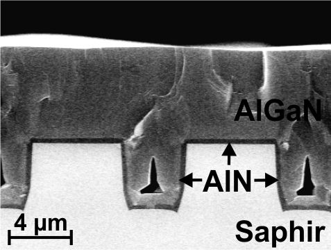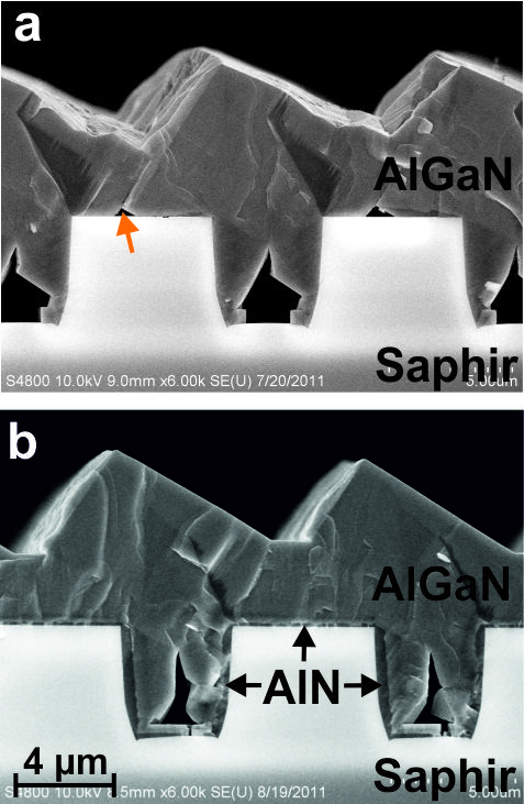 Fig. 1 Cross section images of AlGaN layers (a) arrow: no material is grown on top of the ridges, (b) AlN buffer layer leads to growth on top of the ridges.