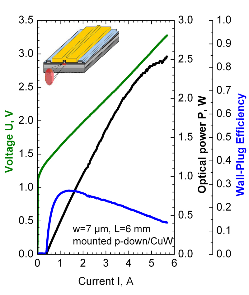 FBH scientists have recently demonstrated high-power ridge waveguides with extremely narrow lateral and vertical far field angles of 12° x 17° respectively (95% power content), that operate kink-free in a single lateral mode to continuous wave powers in excess of 1 W, and reach a peak power of over 2.5 W.