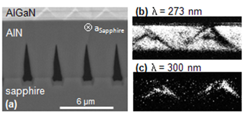 Fig. 1: AlGaN absorber layer on ELO template: cross-section backscattered electron microscopy image (a) and monochromatic cathodoluminescence images (b, c) from cleaved edge at 100 K.