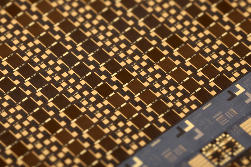 Fig. 2: AlGaN MSM photodetectors on sapphire in different interdigitated designs and several test structures.