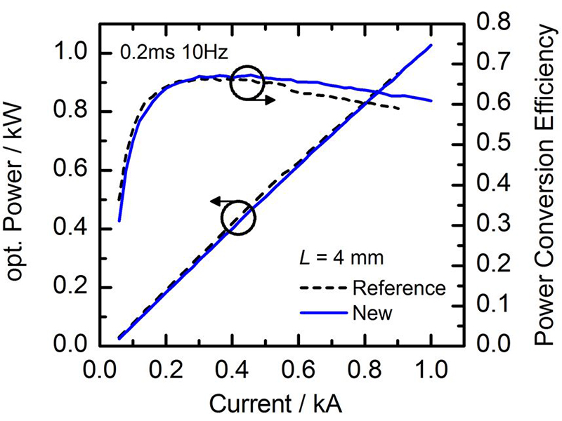 Optimization of the epitaxial design for high-efficiency emission at the kW level targets structures with low losses ai, waveguides with low electrical resistance per unit area Rs/A, and improved temperature stability [2]. Fig. 1 compares results on 1 cm wide laser bars that are fabricated with a newly designed FBH structure (blue, solid lines, tailored for high ηE at high output power Pout) to bars fabricated using a commercially available reference design (black, dashed), taken from [3]. The bars have 4 mm long resonators and are identically fabricated and packaged. The new design maintains ηE > 60% at Pout = 1 kW under 0.2% duty cycle test conditions, significantly improved over the reference design.