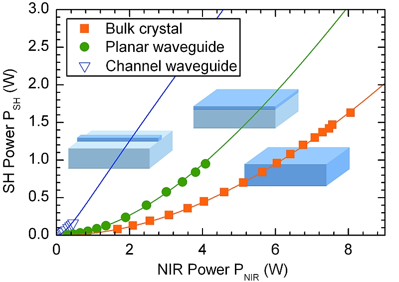Fig. 1: Visible power dependence on near-infrared power during frequency doubling of diode lasers in bulk crystals, planar waveguides and channel waveguides.
